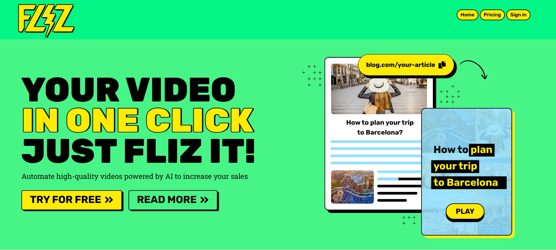 - Article to Video: Fliz AI can transform a product listing into a sales video, extracting information such as the description and images, and generating a script specifically tailored to your product. The video will be ready with your product images, background music, a professional voiceover, and subtitles.